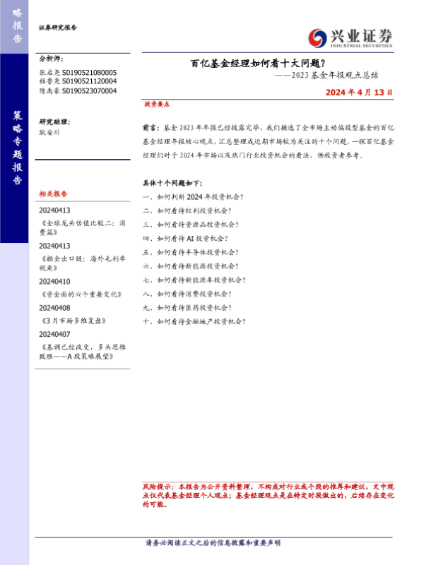 【兴业证券】【20240413】2023基金年报观点总结:百亿基金经理如何看十大问题?-18页
