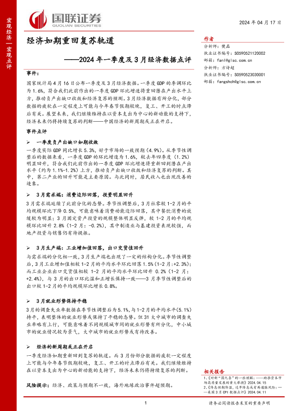【国联证券】【20240417】2024年一季度及3月经济数据点评:经济如期重回复苏轨道-16页