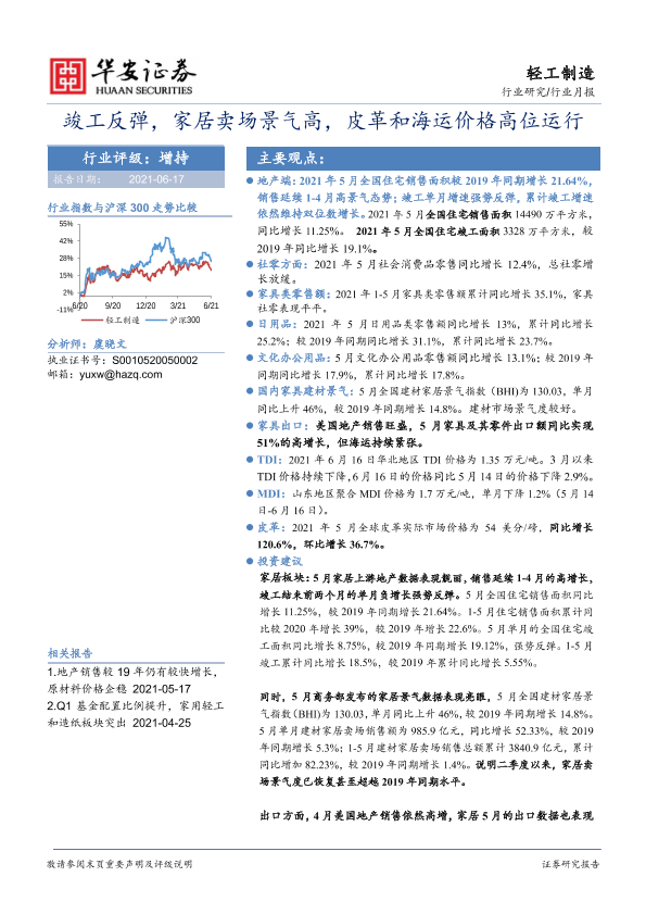 【华安证券】【20210617】轻工制造行业月报:竣工反弹,家居卖场景气高,皮革和海运价格高位运行-24页