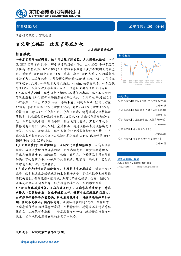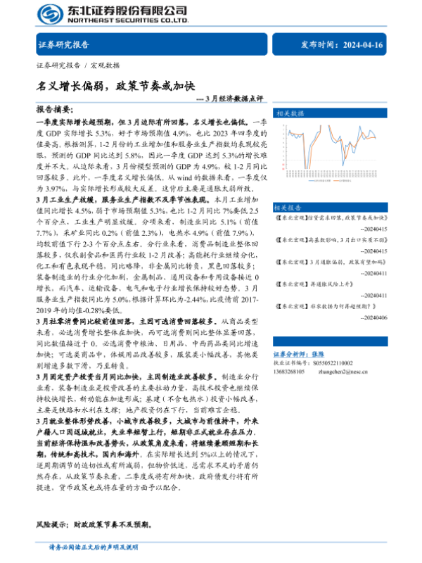 【东北证券】【20240416】3月经济数据点评:名义增长偏弱,政策节奏或加快-13页