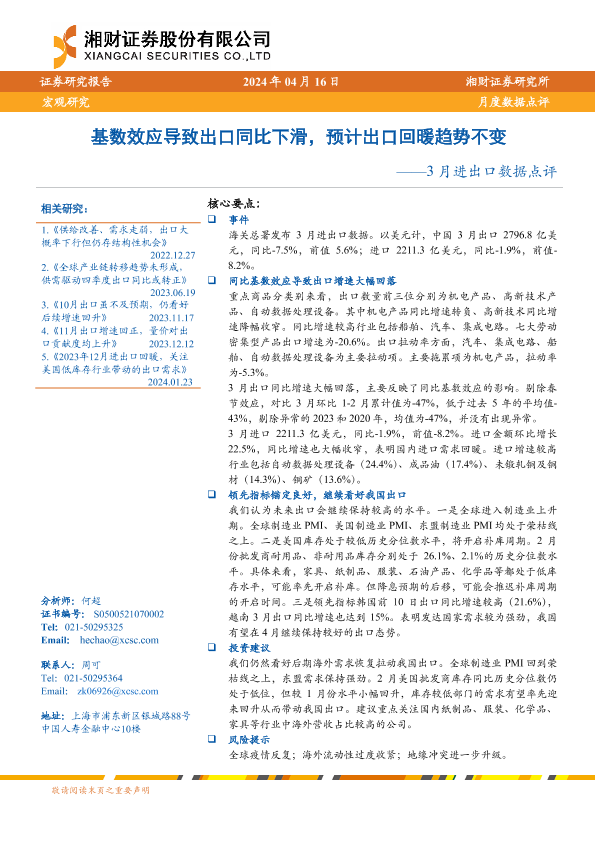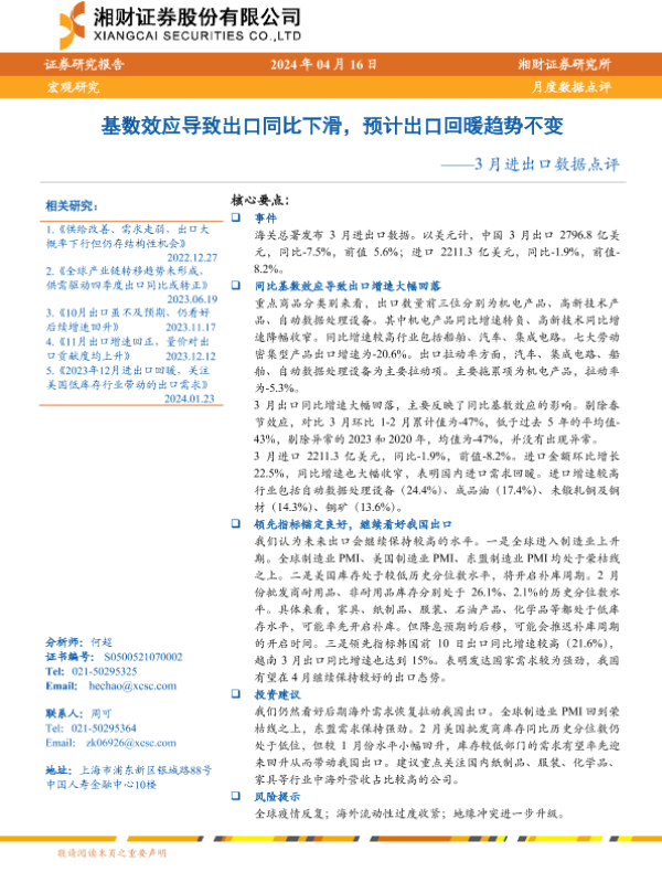 【湘财证券】【20240416】3月进出口数据点评:基数效应导致出口同比下滑,预计出口回暖趋势不变-10页