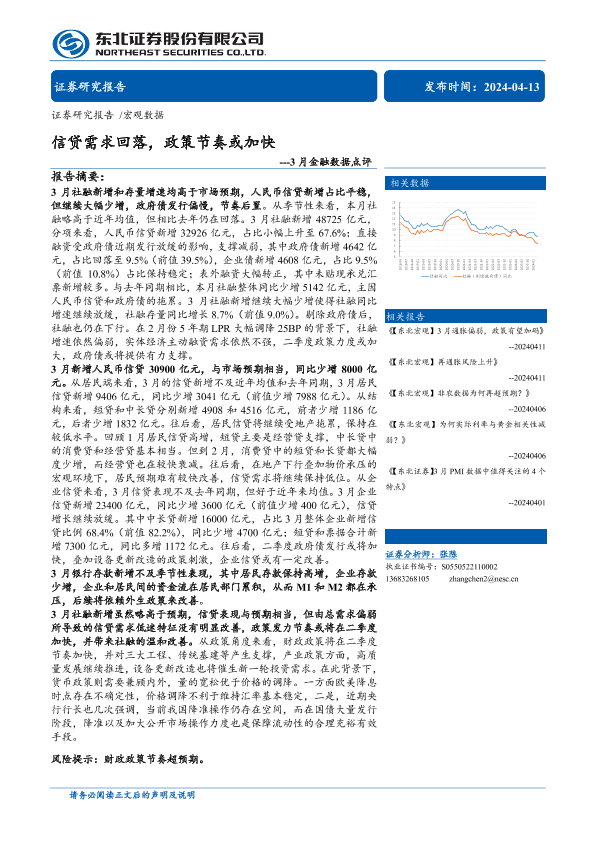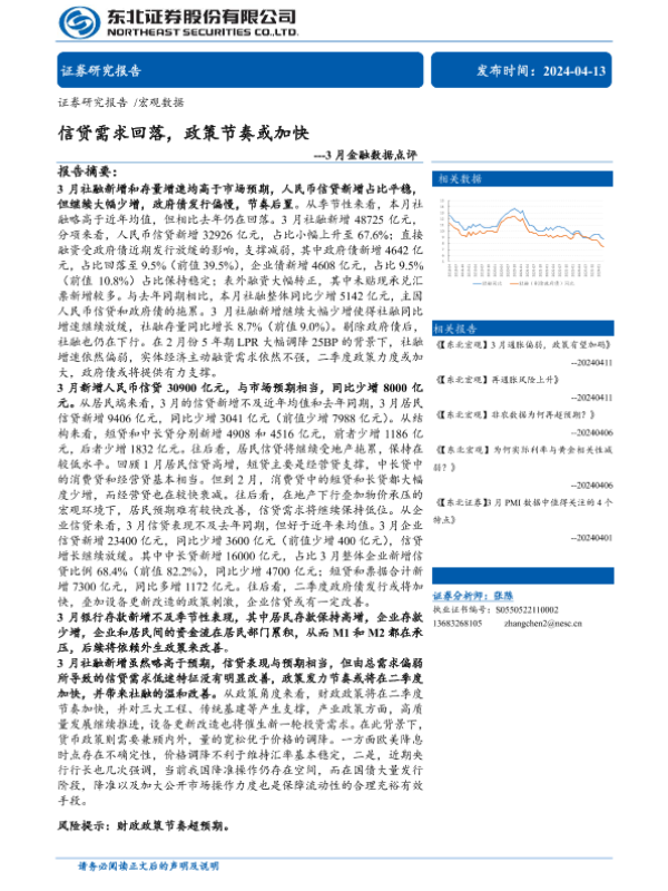 【东北证券】【20240413】3月金融数据点评:信贷需求回落,政策节奏或加快-10页