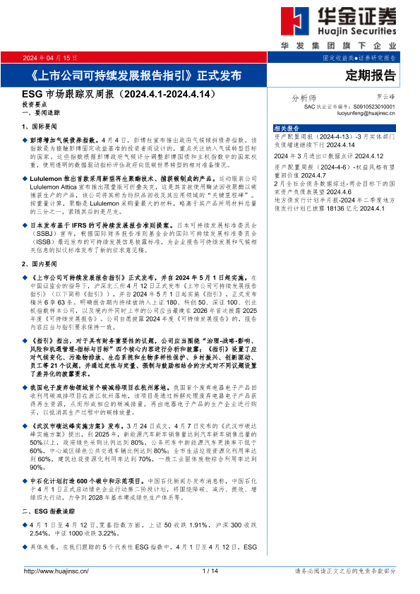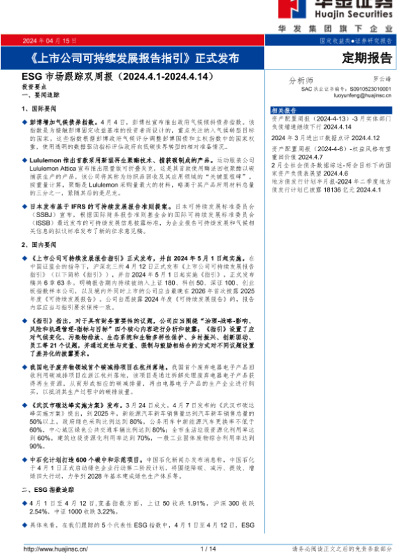 【华金证券】【20240415】ESG市场跟踪双周报:《上市公司可持续发展报告指引》正式发布-14页