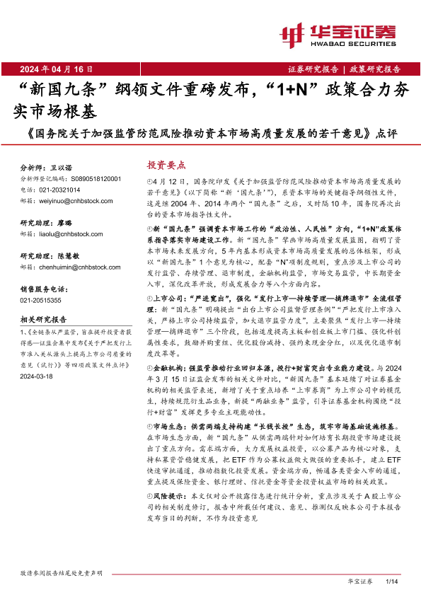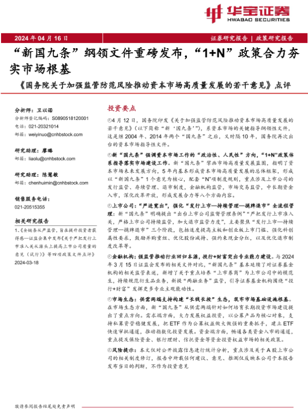 【华宝证券】【20240416】国务院关于加强监管防范风险推动资本市场高质量发展的若干意见-14页