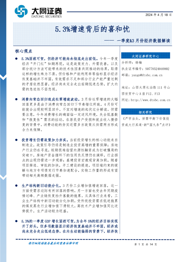 【大同证券】【20240418】一季度&3月份经济数据解读:5.3%增速背后的喜和忧-14页