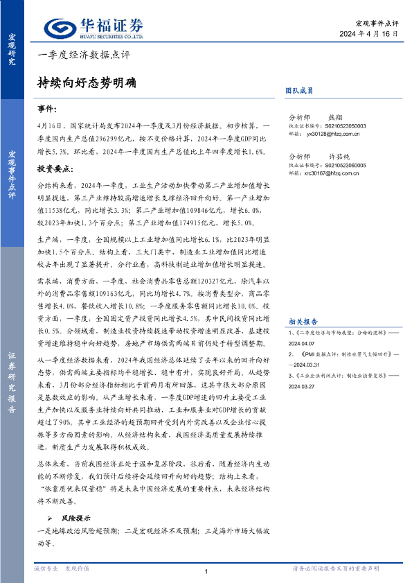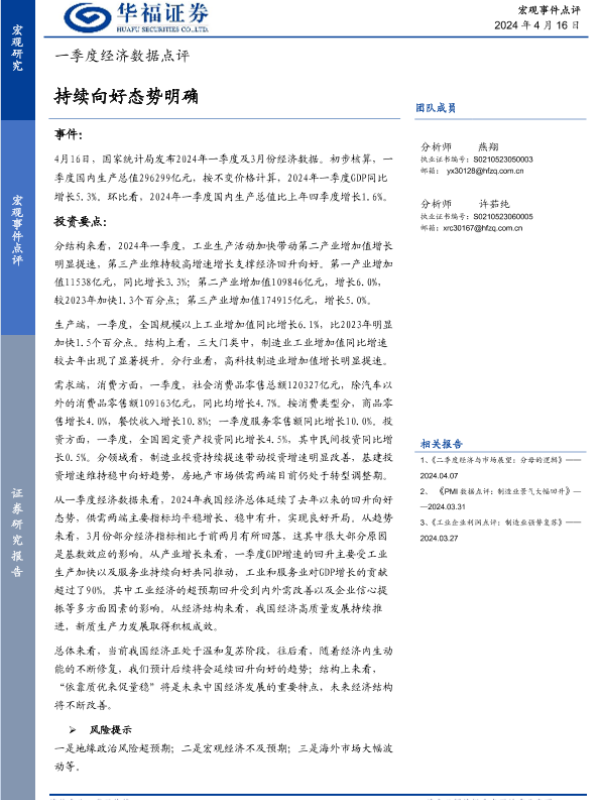 【华福证券】【20240416】一季度经济数据点评:持续向好态势明确-12页
