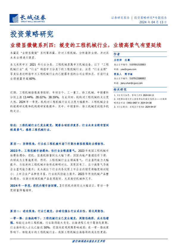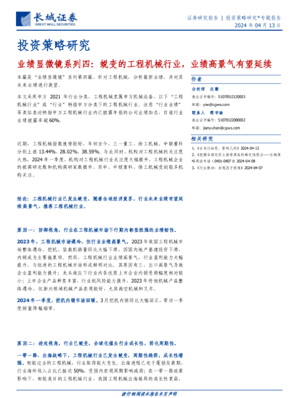 【长城证券】【20240413】业绩显微镜系列四:蜕变的工程机械行业,业绩高景气有望延续-13页
