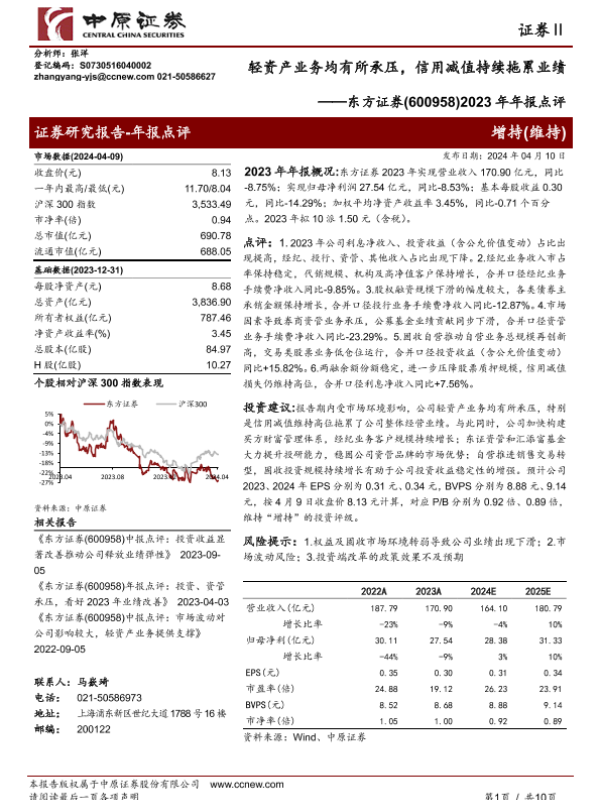 【中原证券】【20240410】东方证券-600958.SH-2023年年报点评:轻资产业务均有所承压,信用减值持续拖累业绩-10页