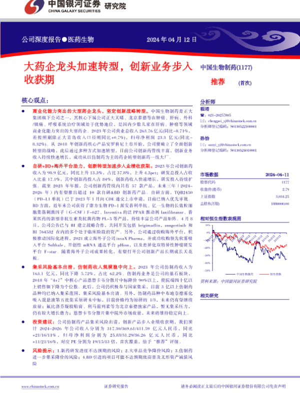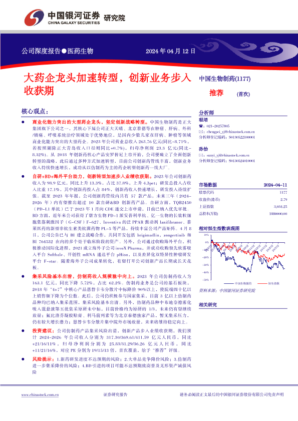 【银河证券】【20240412】中国生物制药(01177.HK)大药企龙头加速转型,创新业务步入收获期-44页