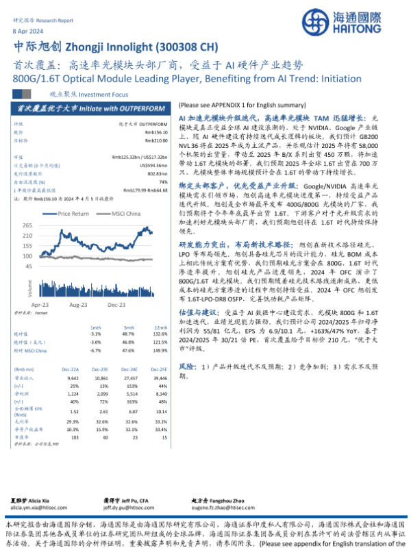 【海通国际】【20240408】中际旭创-300308.SZ-首次覆盖:高速率光模块头部厂商,受益于AI硬件产业趋势-22页