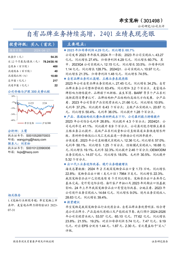 【华安证券】【20240417】乖宝宠物-自有品牌业务持续高增,24Q1业绩表现亮眼-10页