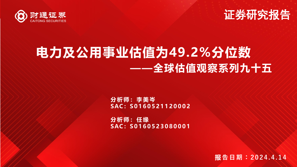 【财通证券】【20240414】全球估值观察系列九十五:电力及公用事业估值为49.2%分位数-29页