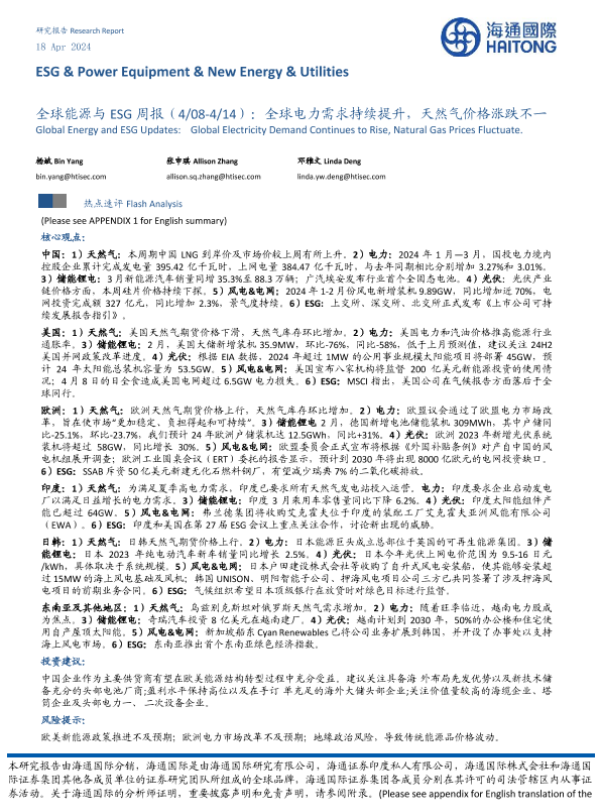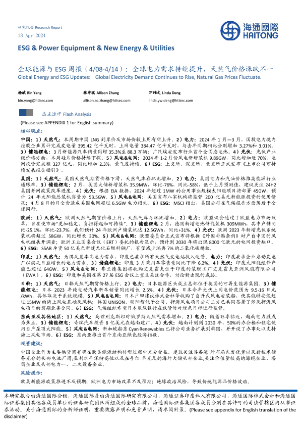【海通国际】【20240418】全球能源行业与ESG(4/08-4/14):全球电力需求持续提升,天然气价格涨跌不一-41页