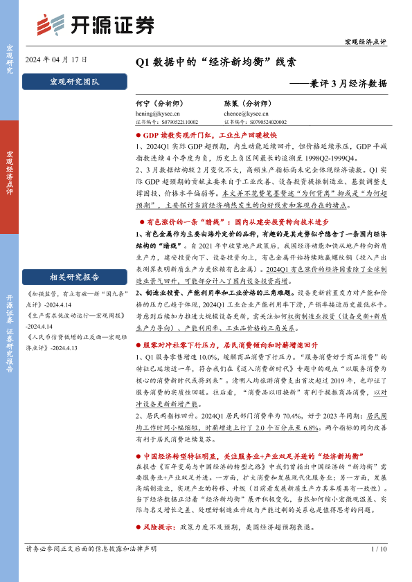 【开源证券】【20240417】兼评3月经济数据:Q1数据中的“经济新均衡”线索-10页
