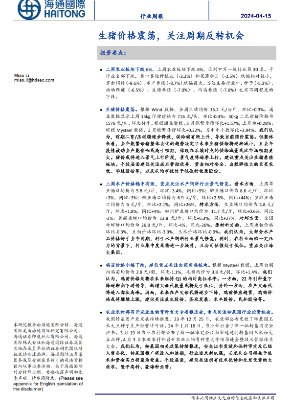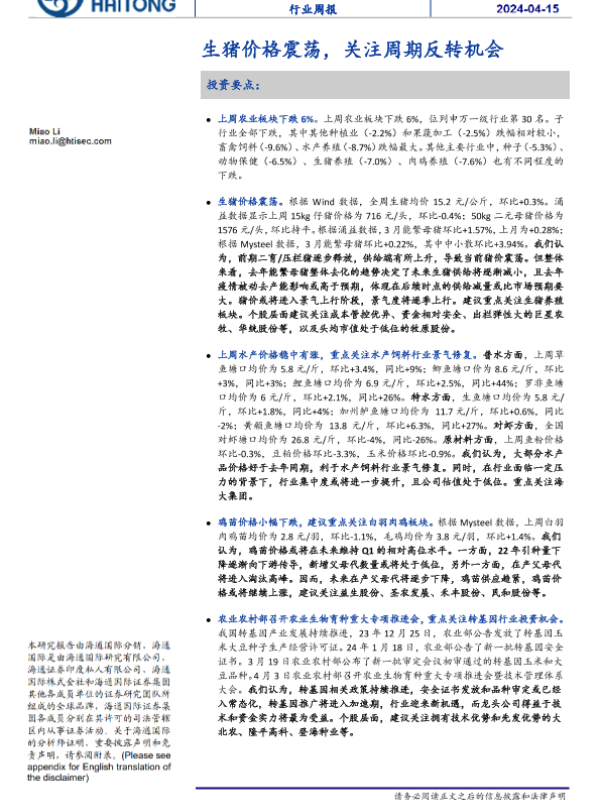 【海通国际】【20240415】农业行业:生猪价格震荡,关注周期反转机会-19页