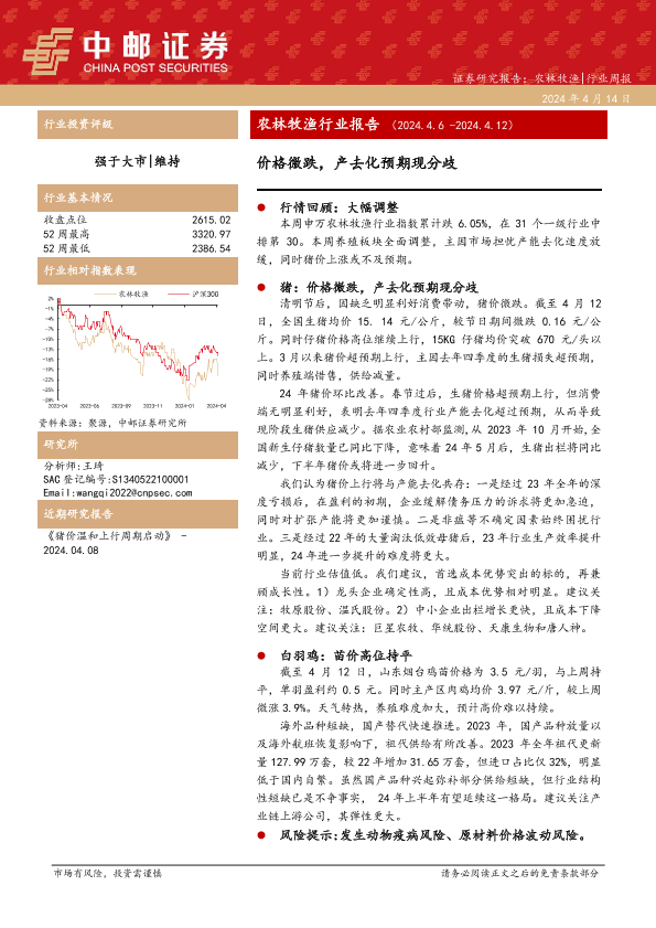 【中邮证券】【20240414】农林牧渔行业报告:价格微跌,产去化预期现分歧-12页