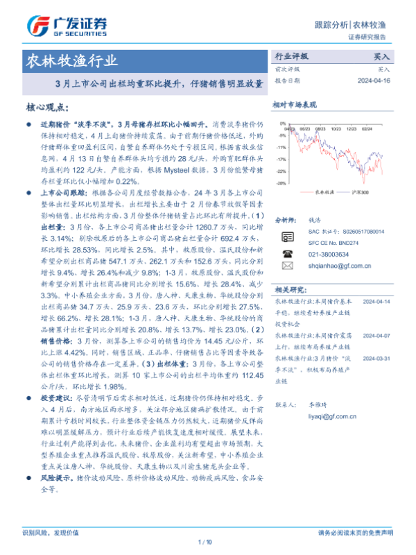 【广发证券】【20240416】农林牧渔行业:3月上市公司出栏均重环比提升,仔猪销售明显放量-10页