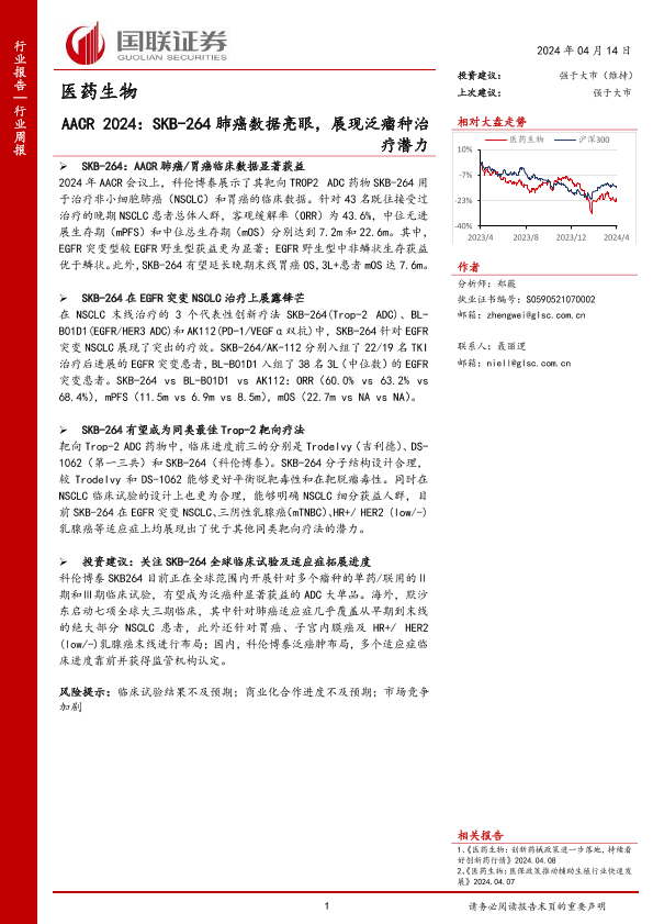 【国联证券】【20240414】医药生物行业AACR+2024:SKB-264肺癌数据亮眼,展现泛瘤种治疗潜力-16页