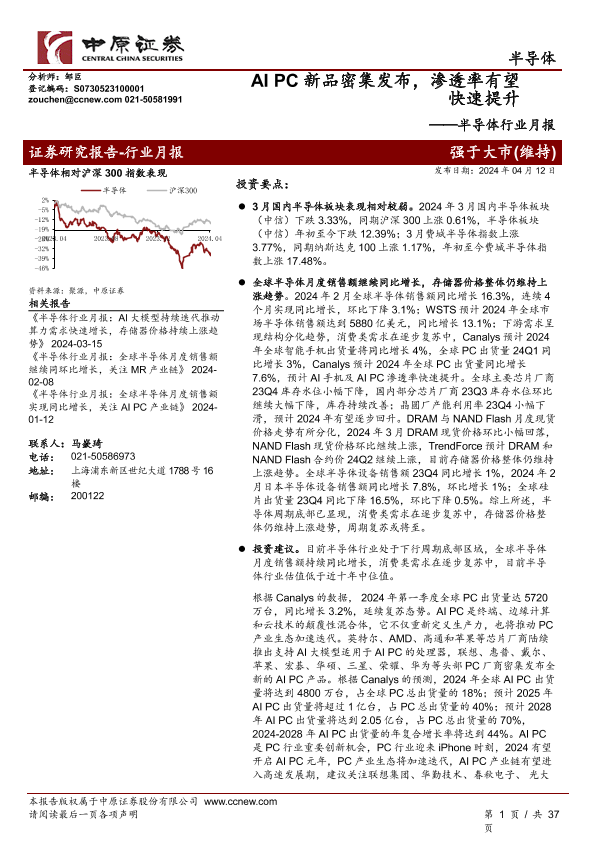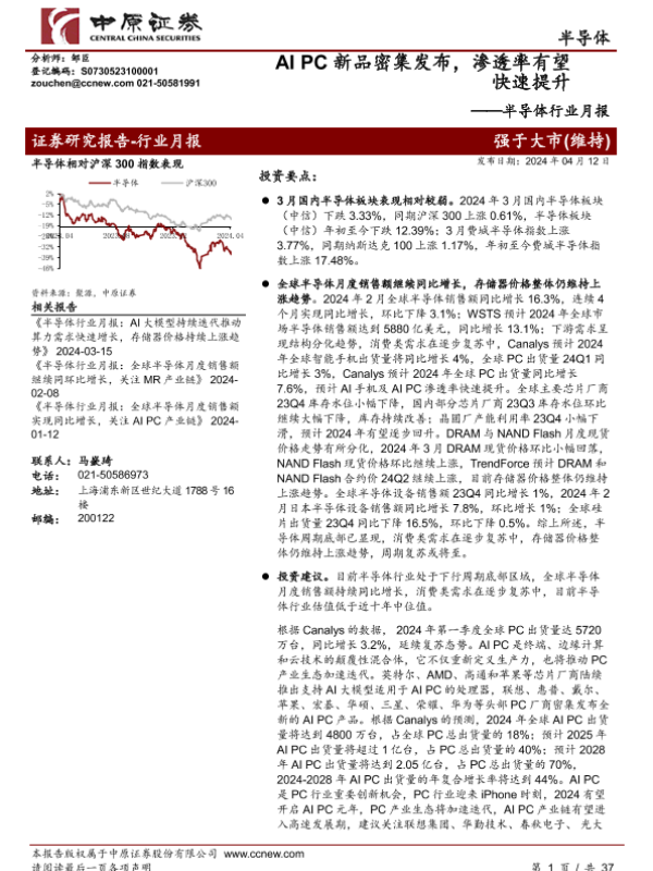 【中原证券】【20240412】半导体行业月报:AI+PC新品密集发布,渗透率有望快速提升-37页