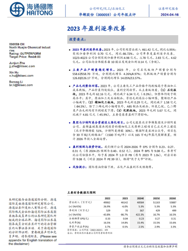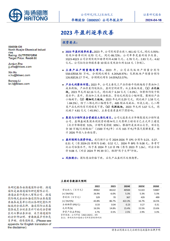 【海通国际】【20240415】华锦股份-000059.SZ-公司年报点评:2023年盈利逐季改善-12页