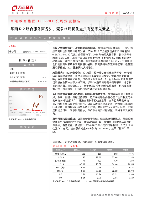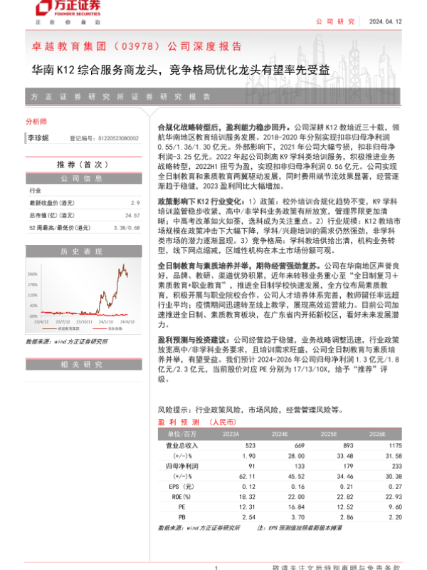【方正证券】【20240412】卓越教育集团(03978.HK)公司深度报告:华南K12综合服务商龙头,竞争格局优化龙头有望率先受益-28页