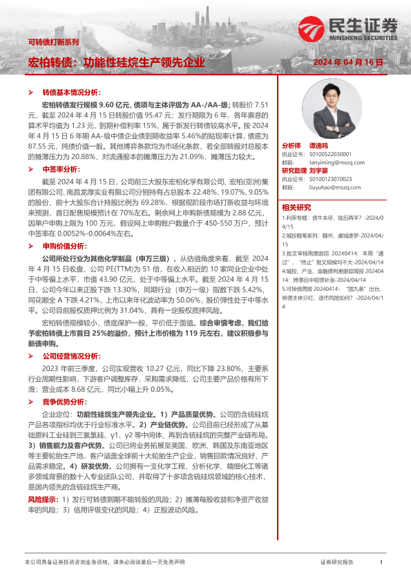 【民生证券】【20240416】可转债打新系列:宏柏转债,功能性硅烷生产领先企业-14页