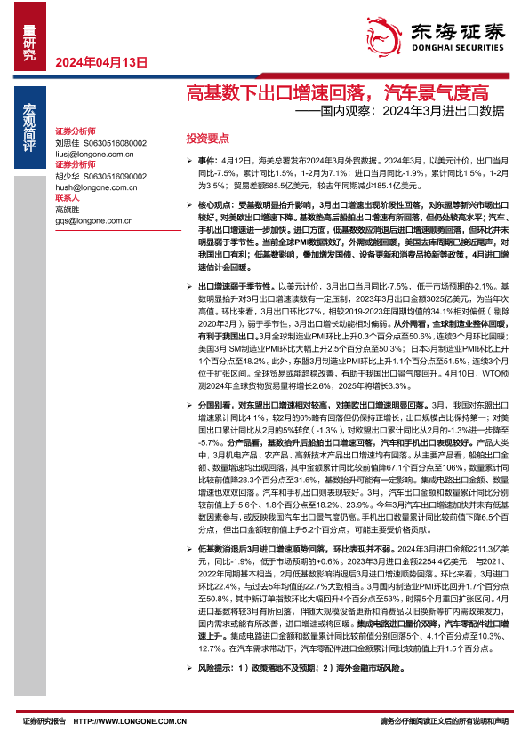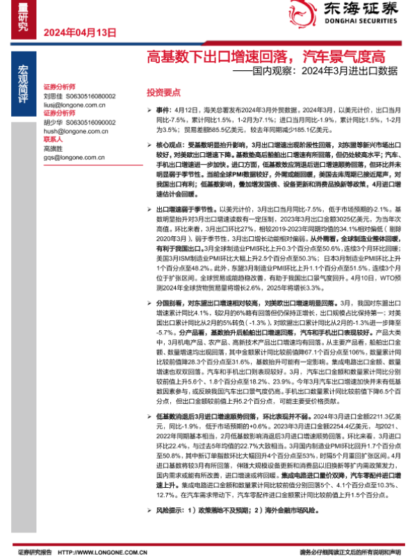 【东海证券】【20240413】高基数下出口增速回落,汽车景气度高——国内观察:2024年3月进出口数据-10页