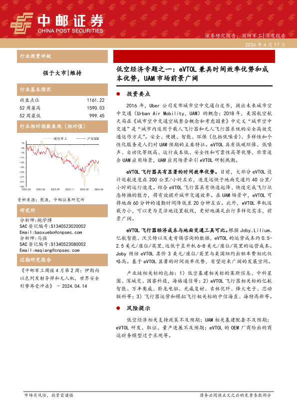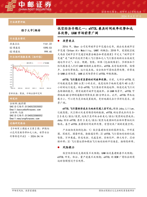 【中邮证券】【20240417】国防军工行业低空经济专题之一:eVTOL兼具时间效率优势和成本优势,UAM市场前景广阔-20页