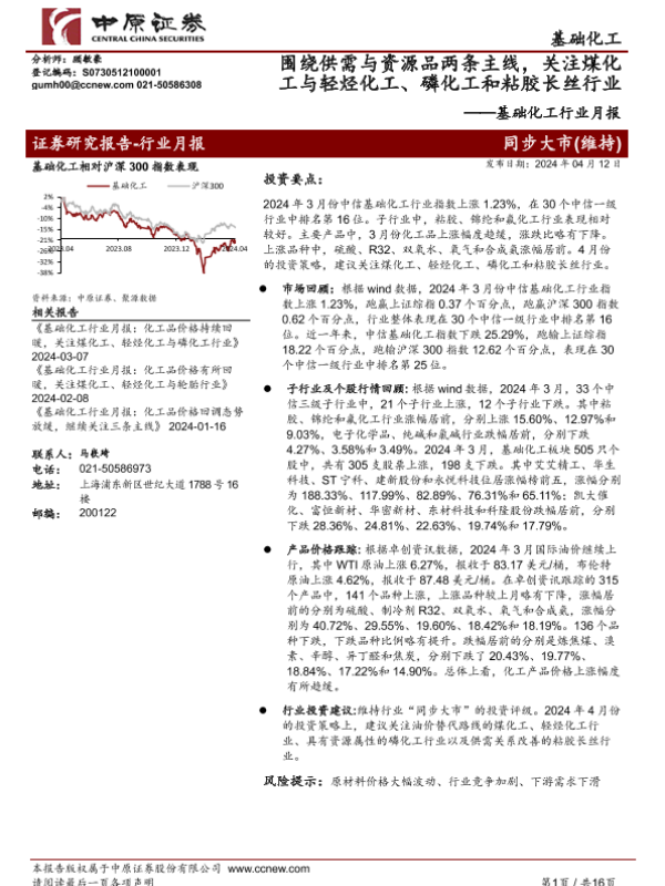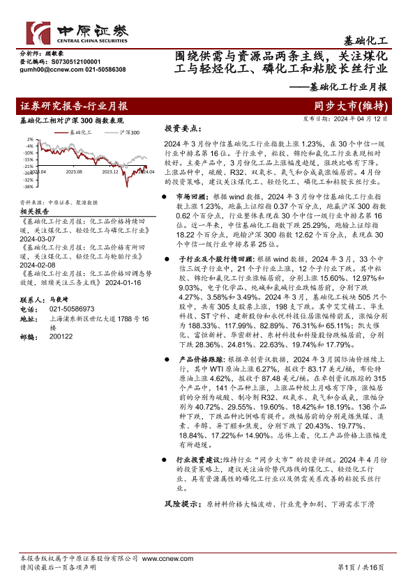 【中原证券】【20240412】基础化工行业月报:围绕供需与资源品两条主线,关注煤化工与轻烃化工、磷化工和粘胶长丝行业-16页