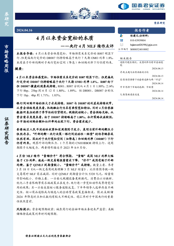 【国泰君安证券】【20240416】央行4月MLF续作点评:4月以来资金宽松的本质-10页