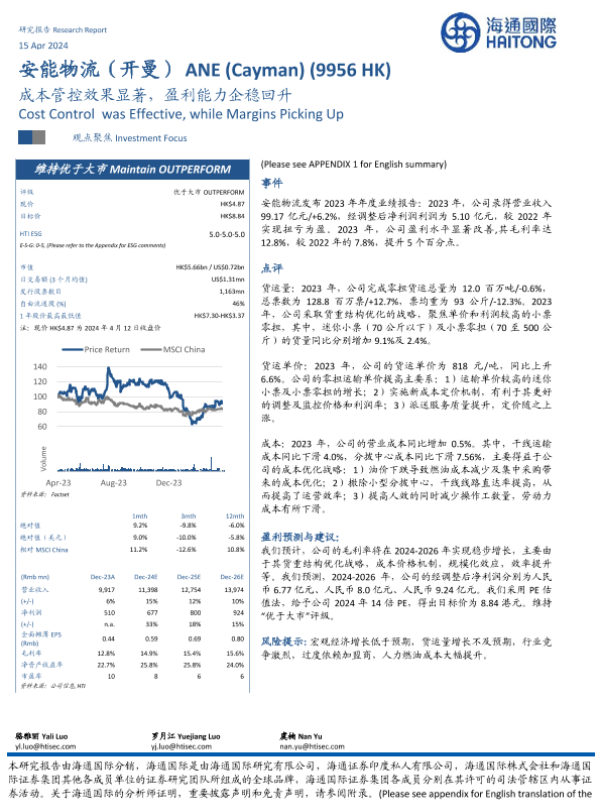 【海通国际】【20240415】安能物流(开曼)(09956.HK)成本管控效果显著,盈利能力企稳回升-12页