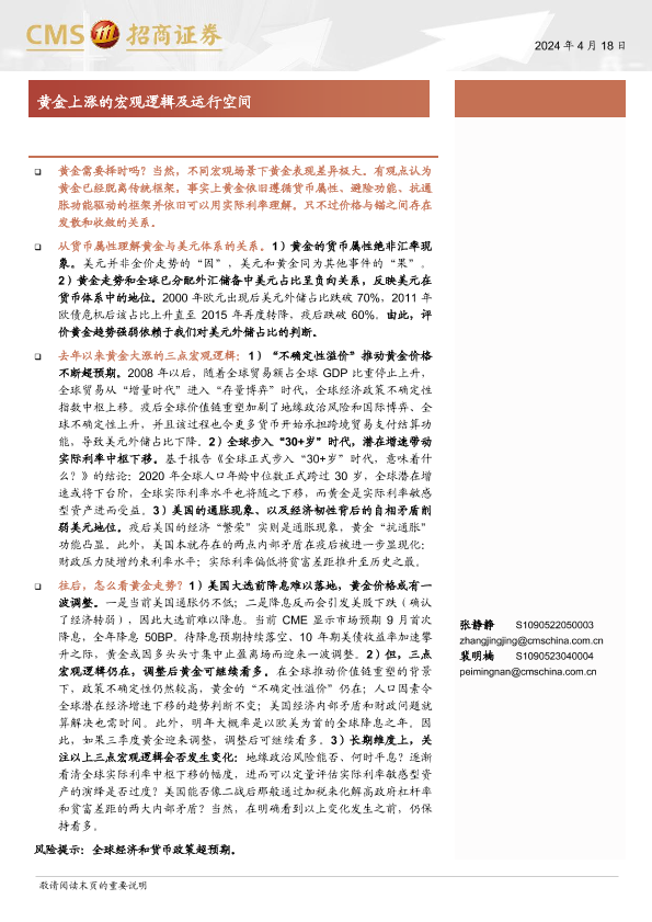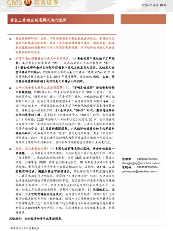 【海通证券】【20240418】宏观分析报告:黄金上涨的宏观逻辑及运行空间-14页