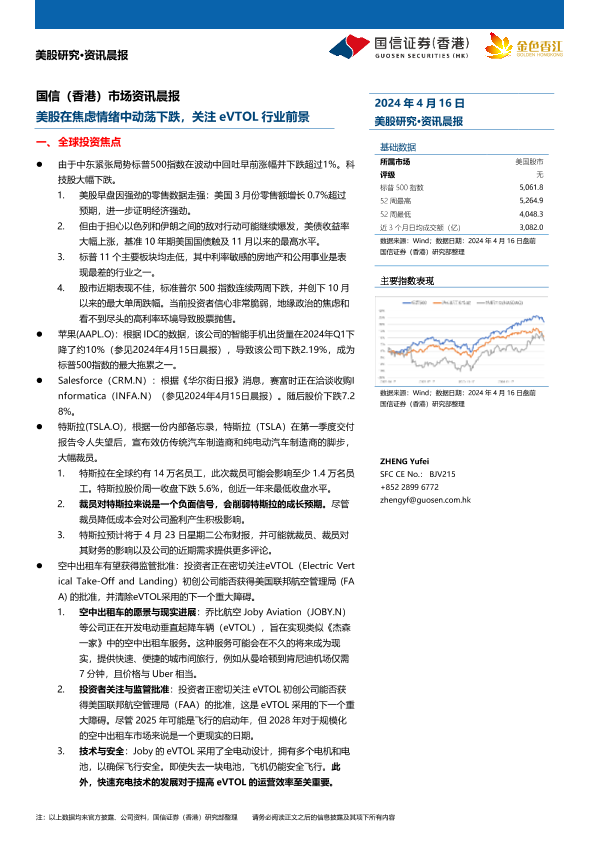 【国信证券(香港)】【20240416】市场:美股在焦虑情绪中动荡下跌,关注eVTOL行业前景-12页