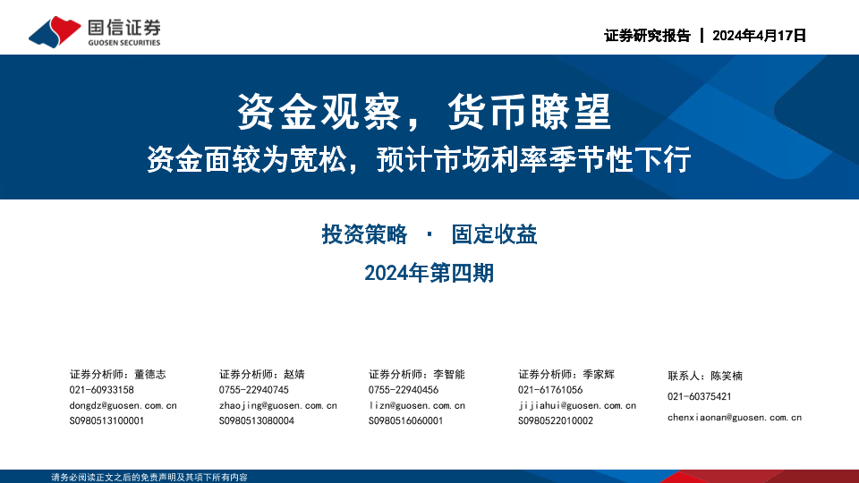 【国信证券】【20240417】投资策略·固定收益2024年第四期:资金观察,货币瞭望,资金面较为宽松,预计市场利率季节性下行-28页