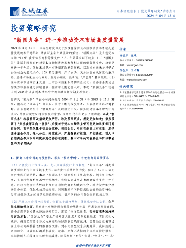 【长城证券】【20240413】投资策略研究:“新国九条”进一步推动资本市场高质量发展-11页