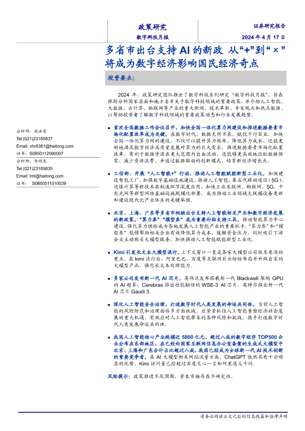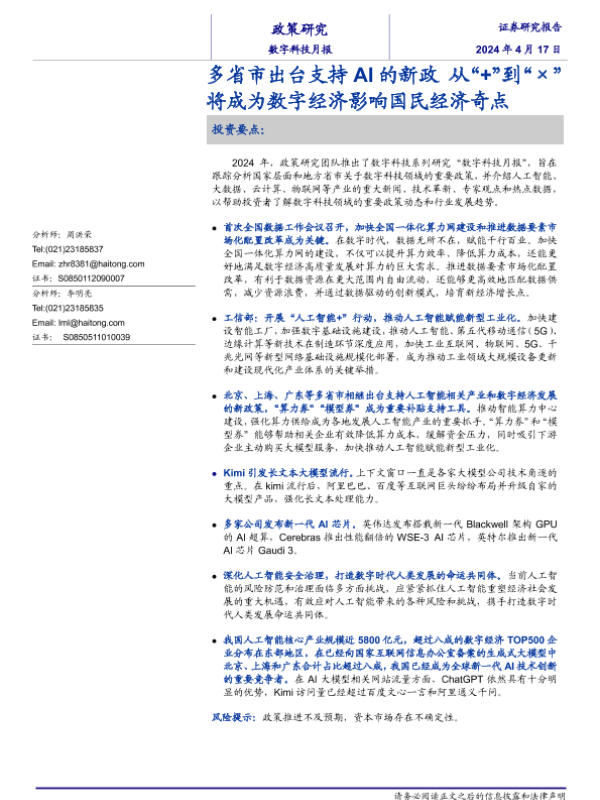 【海通证券】【20240417】多省市出台支持AI的新政从“+”到“×”将成为数字经济影响国民经济奇点-21页