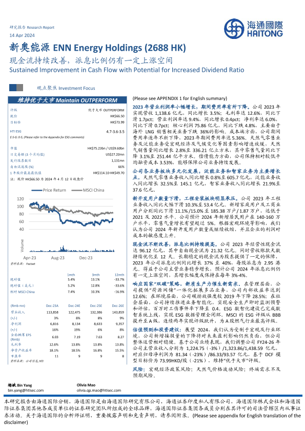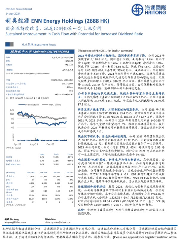 【海通国际】【20240414】新奥能源(2688.HK)现金流持续改善,派息比例仍有一定上涨空间-10页