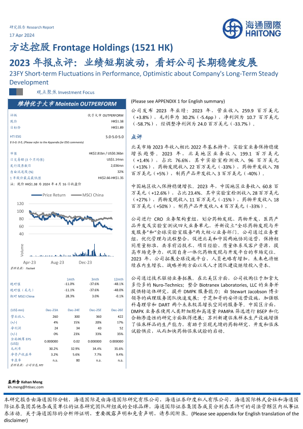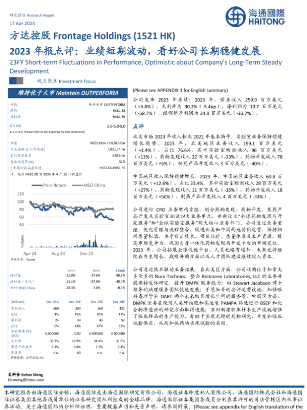 【海通国际】【20240417】方达控股(01521.HK)2023年报点评:业绩短期波动,看好公司长期稳健发展-14页