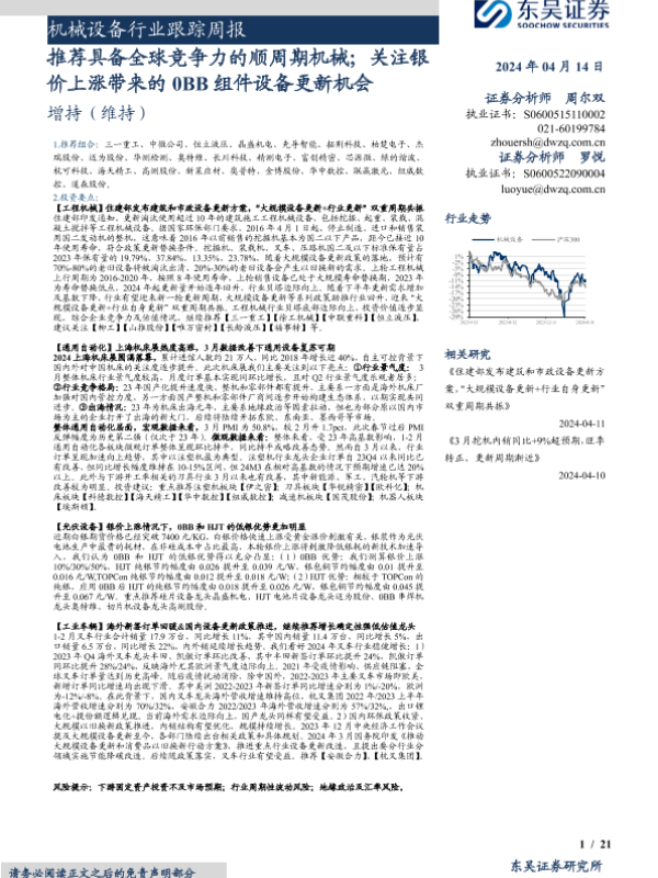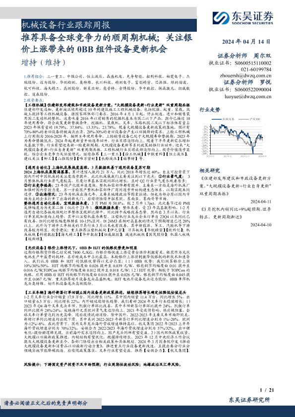 【东吴证券】【20240414】机械设备行业跟踪周报:推荐具备全球竞争力的顺周期机械;关注银价上涨带来的0BB组件设备更新机会-21页
