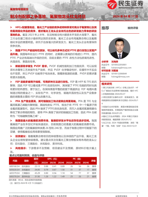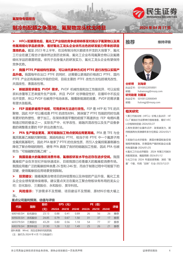 【民生证券】【20240417】氟聚物行业专题报告:制冷剂配额之争落地,氟聚物龙头枕戈待旦-40页