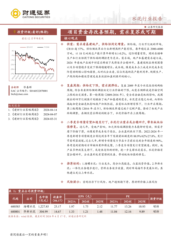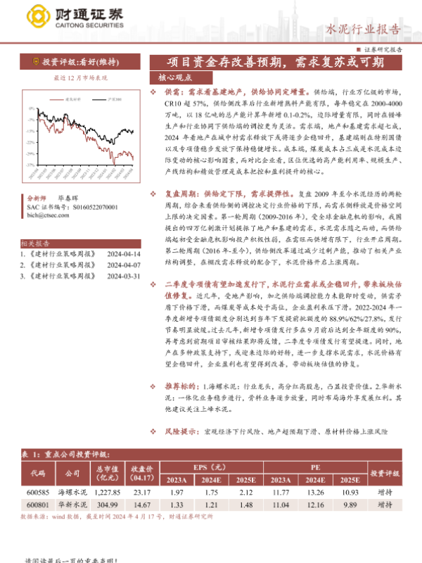 【财通证券】【20240417】水泥行业报告:项目资金存改善预期,需求复苏或可期-59页