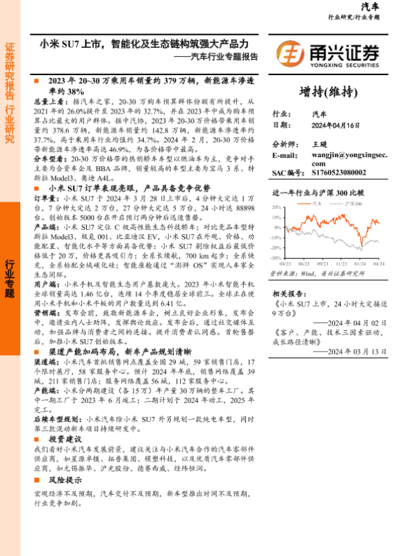 【甬兴证券】【20240416】汽车行业专题报告:小米SU7上市,智能化及生态链构筑强大产品力-22页