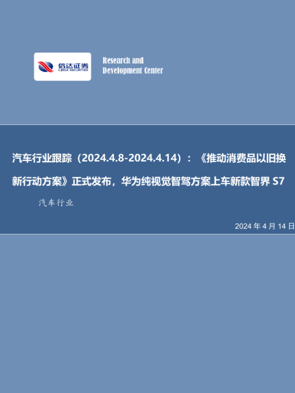 【信达证券】【20240414】汽车行业跟踪(2024.4.8-2024.4.14):《推动消费品以旧换新行动方案》正式发布,华为纯视觉智驾方案上车新款智界S7-24页