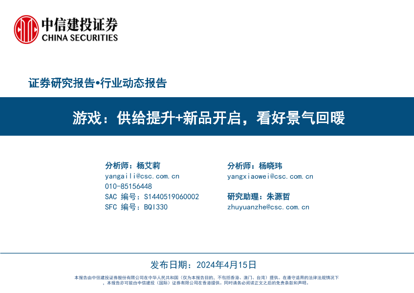 【中信建投证券】【20240415】游戏行业:供给提升+新品开启,看好景气回暖-33页