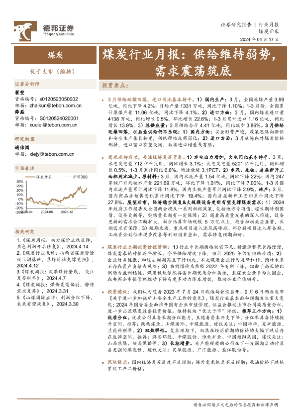 【德邦证券】【20240417】煤炭行业月报:供给维持弱势,需求震荡筑底-10页