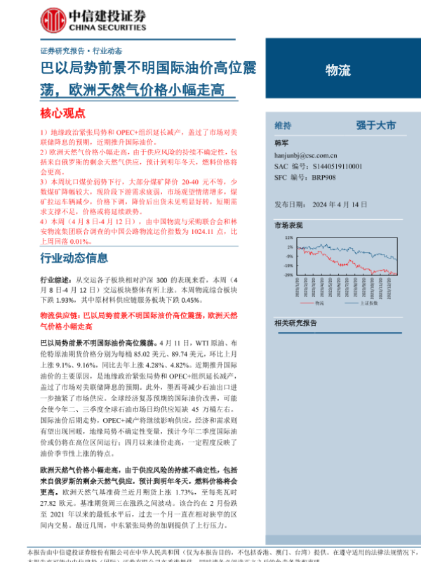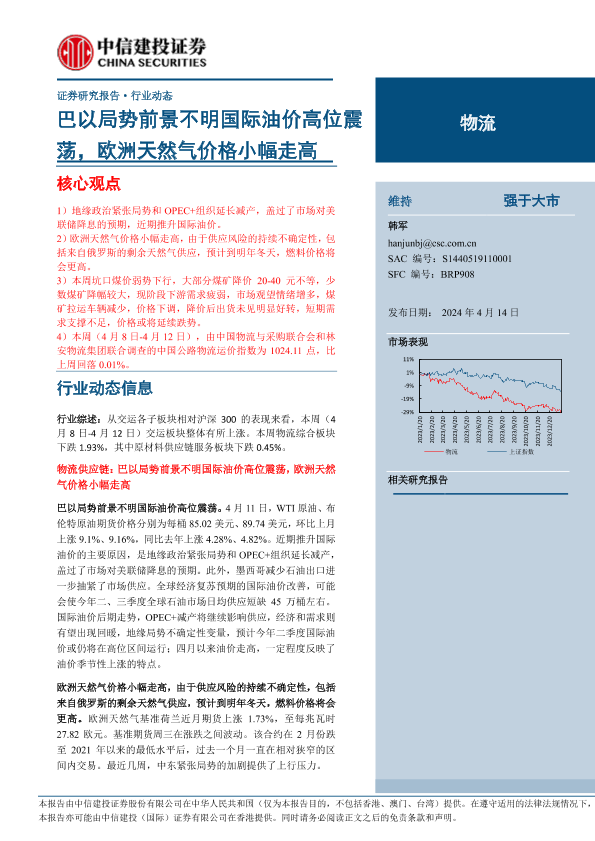 【中信建投证券】【20240414】物流行业:巴以局势前景不明国际油价高位震荡,欧洲天然气价格小幅走高-16页