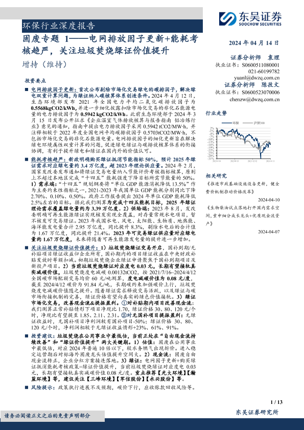 【东吴证券】【20240414】环保行业深度报告:固废专题1,电网排放因子更新+能耗考核趋严,关注垃圾焚烧绿证价值提升-13页