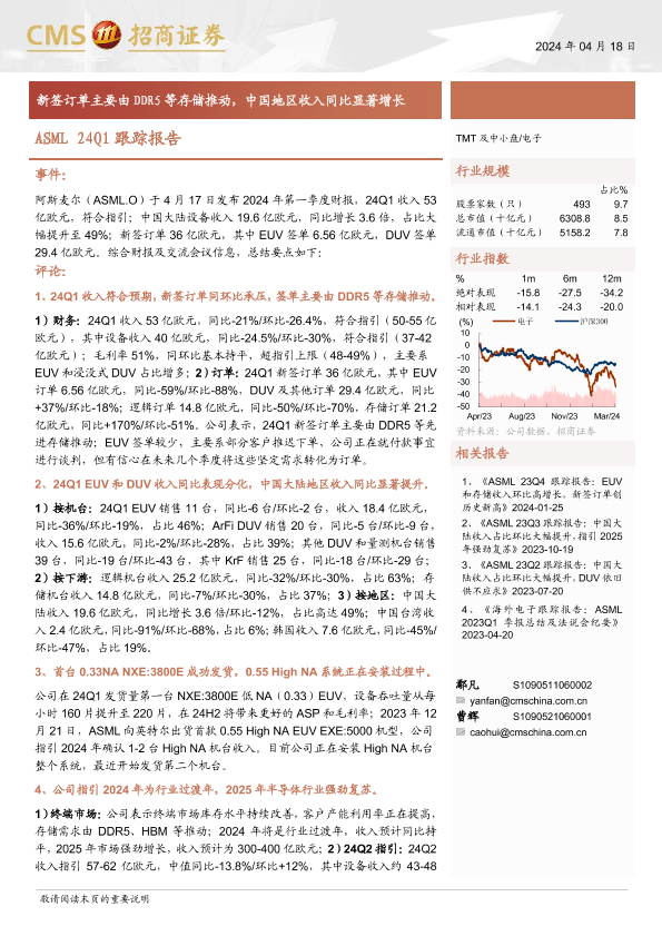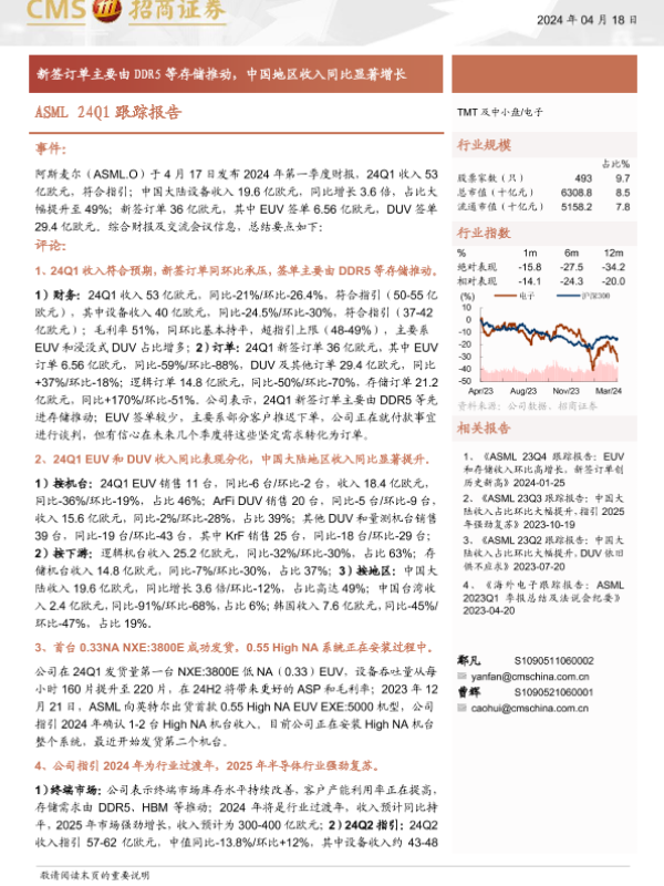 【海通证券】【20240418】电子行业ASML+24Q1跟踪报告:新签订单主要由DDR5等存储推动,中国地区收入同比显著增长-11页