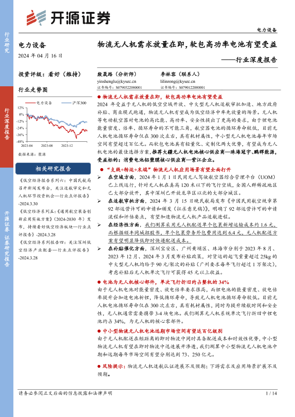 【开源证券】【20240416】电力设备行业深度报告:物流无人机需求放量在即,软包高功率电池有望受益-14页