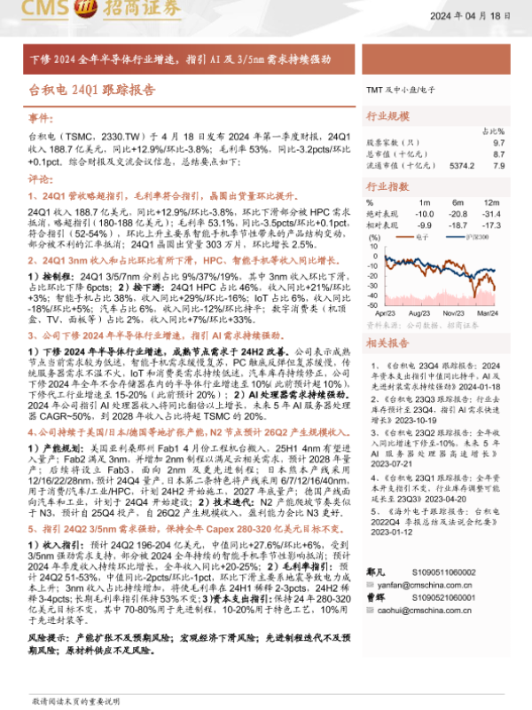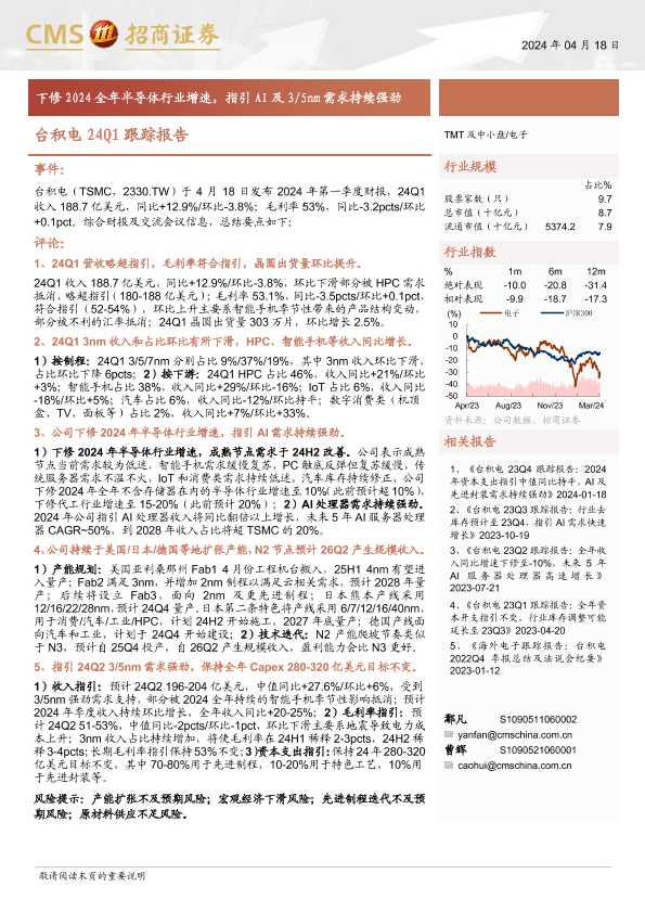 【海通证券】【20240418】电子行业台积电24Q1跟踪报告:下修2024全年半导体行业增速,指引AI及3/5nm需求持续强劲-10页